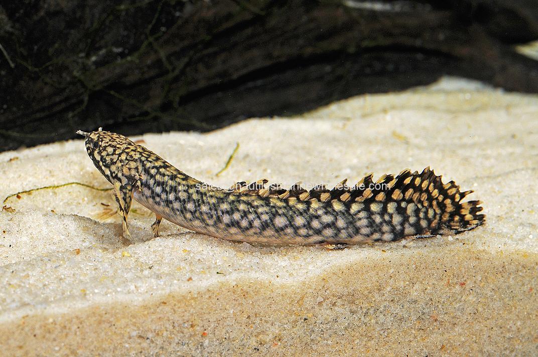 SCIENTIFIC NAME: Polypterus ornatipinnis The Ornate Bichir, Polypterus ornatipinnis, is arguably one of the most attractive species in the Bichir group. It is a Lobe-finned Pike, a freshwater fish originating from rivers, lakes, ponds and marshes of Central Africa, where they forage along the substrate for small fish, worms, crustaceans and similar meaty foods. The Ornate Bichir is semi-aggressive in the fact that they will swallow any fish or invertebrate that they can fit into their mouth. As with other members of the primitive Polypteridae family, the Ornate Bichir has the unique ability to survive out of water. With a lung-like paired swimbladder and gills to help breathing, the Ornate Bichir can spend short periods of time on land, but must soon return to its water environment for adequate respiration. Obtaining a length of 24 inches, the Ornate Bichir ideally does best in a large aquarium of at least six foot long and two foot wide with other ‘oddball’ inhabitants. A densely planted aquarium with numerous hiding places and a sandy bottom with areas of subdued lighting would help this species flourish. Be careful in choosing passive tank mates for the Bichir, as Bichirs are very passive towards other large fish. However, they are aggressive towards their own kind, and only one should be incorporated into an aquarium, unless the aquarium is very large. Prone to jumping, a tight, well-sealed aquarium lid is highly recommended.